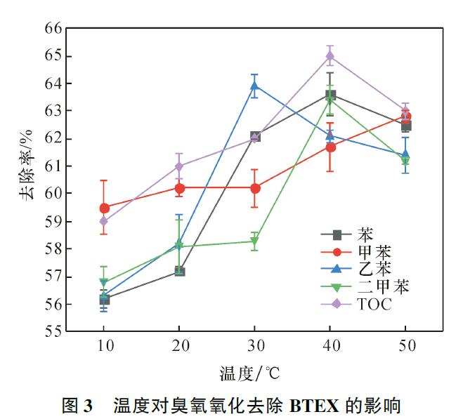 本實(shí)驗(yàn)的主要目標(biāo)是尋找臭氧降解BTEX的 很佳反應(yīng)溫度。實(shí)驗(yàn)設(shè)定5個(gè)溫度變量,分別為10℃、20℃、30℃、40℃、50℃。實(shí)驗(yàn)中目標(biāo)有機(jī)物的去除效率以TOC的濃度變化來評(píng)定。溫度對(duì)臭氧氧化去除BTEX的影響如圖3所示。