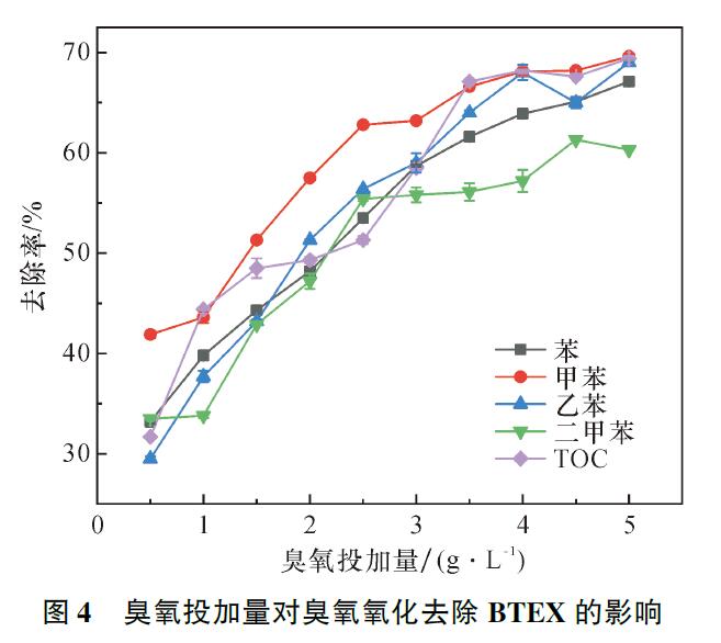 臭氧的通氣量直接影響目標(biāo)有機(jī)污染物的降解效果和實(shí)際處理過程中的工藝成本。根據(jù)前人的研究成果可知,臭氧濃度越高則有機(jī)物去除率越大。但在實(shí)際處理過程中,考慮運(yùn)行成本等因素,不能一味增加臭氧投加量來提高反應(yīng)效率。因此,本研究主要探索臭氧投加量對(duì)BTEX去除的影響(圖4)。