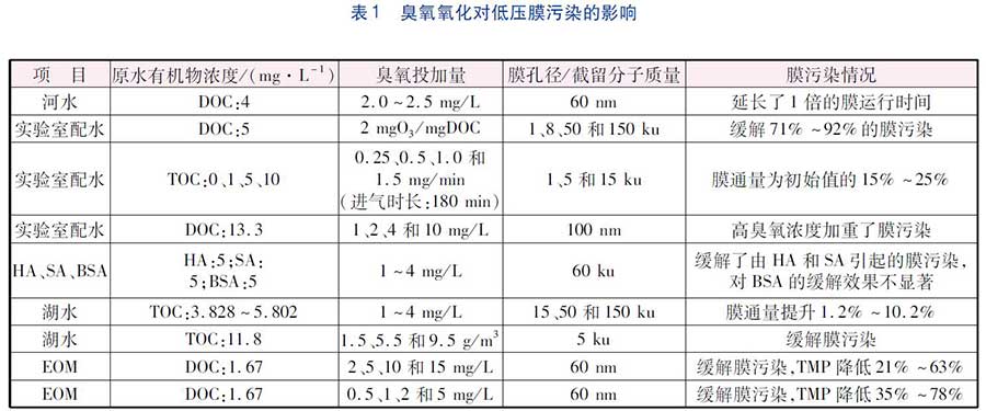 單獨臭氧氧化技術(shù)在緩解低壓膜污染方面受到了廣泛關(guān)注,但關(guān)于其對膜污染的緩解效果研究結(jié)論尚未統(tǒng)一。綜合目前的研究發(fā)現(xiàn),單獨臭氧氧化對膜污染的緩解效果主要與原水水質(zhì)、水力條件、膜孔徑/截留分子質(zhì)量、臭氧投加量和投加方式等因素有關(guān)。