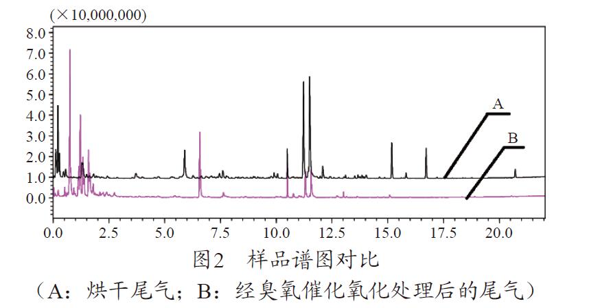 江蘇XX 醫藥生產企業,烘干尾氣,即使經過三級堿噴淋,仍然惡臭異味明顯。應用臭氧催化氧化技術的小試裝置,進行現場實驗,實驗結果如圖2。異味去除明顯,在實驗裝置的排放口基本嗅不到異味,經三方檢測,惡臭無量綱數值小于300。