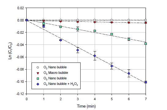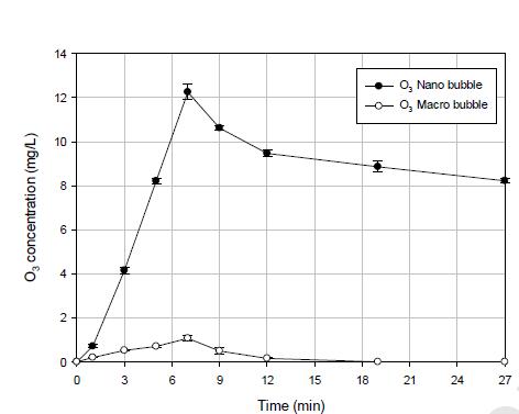 我們可以通過(guò)產(chǎn)生納米氣泡來(lái)增加氣泡的總表面積。較大的表面積意味著臭氧氣體從氣體轉(zhuǎn)移到水中的可能性更大。因此,我們比較了大臭氧和納米臭氧的臭氧傳質(zhì)(圖1)。從0到7分鐘,納米臭氧氣體向水中的傳輸速率(1.67 mg / L / min)比大型臭氧(0.17 mg / L / min)快9.8倍。由于其在水溶液中的耐久性,納米臭氧濃度的半衰期比大臭氧的半衰期高23倍。使用納米氣泡時(shí),臭氧濃度的半衰期更長(zhǎng),可以用氣泡排斥理論來(lái)解釋。納米臭氧可以增強(qiáng)臭氧在水相中的耐久性。由于OH離子的選擇性吸附,納米氣泡在各種pH值下都帶有負(fù)電荷。由于H +(-1127 kJ / mol)的水合焓比OH-(-489 kJ / mol)的水合焓低得多,因此納米氣泡的帶電表面會(huì)產(chǎn)生排斥力。這種現(xiàn)象有助于避免氣泡合并。