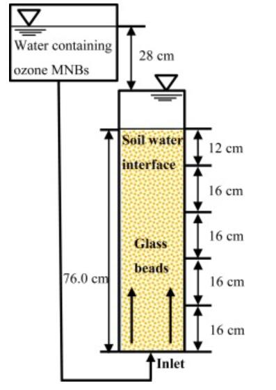 在內(nèi)徑為12 cm 的有機(jī)玻璃圓筒(圖1)中進(jìn)行了柱測(cè)試, 以研究臭氧MNB處理受有機(jī)物污染的地下水。將玻璃珠與甲基橙溶液以10 mg / L的初始濃度混合,以模擬被有機(jī)物污染的土壤和地下水。的比重的玻璃珠是2.43,平均直徑為60微米,干密度為1.43 克/厘米3 。的水力傳導(dǎo)率為1.3 × 10 -4米/秒,因?yàn)椴Aе檫M(jìn)行分級(jí)很差,其表示介質(zhì)的沙子。土壤樣品的高度為76 分別在距底部16 厘米,32 厘米,48 厘米和64 厘米處分布有4個(gè)采樣口#1,#2,#3和#4 。去離子水中不斷產(chǎn)生臭氧MNB,以確保臭氧MNB的數(shù)量保持在峰值。含有臭氧的MNB的水從底部以0.368 的水力梯度i向上供入塔中。不使用MNB的去離子水用于對(duì)比測(cè)試。每個(gè)測(cè)試進(jìn)行兩次以確保數(shù)據(jù)的可重復(fù)性。