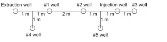 一臺(tái)抽采井,一臺(tái)注入井和五個(gè)監(jiān)控井(其位置如圖2所示)用于原位修復(fù)。 很初的地下水流向是從注入井到提取井。每個(gè)井的深度為16 m,篩選間隔為12 m至16 m。提取井的直徑為25 cm,將提取速率為36 L / min 的泵放置在井內(nèi)15 m 的深度處。注入井和監(jiān)測(cè)井的直徑為5 厘米。注入井與注入單元相連,注入率為15 升/分鐘 由于注入速率受場(chǎng)地和設(shè)施條件的限制,因此采用了較高的抽取速率以產(chǎn)生更強(qiáng)的地下水流。處理殘留的水并將其排放到遠(yuǎn)離測(cè)試區(qū)域的地方。在監(jiān)測(cè)井中安裝了地下水采樣器,以收集15 m 深度的樣品。