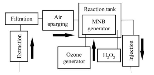 開發(fā)了現(xiàn)場(chǎng)修復(fù)設(shè)備(圖3 )用于現(xiàn)場(chǎng)測(cè)試。修復(fù)系統(tǒng)包含三個(gè)部分:提取單元,反應(yīng)單元和注射單元。從該地點(diǎn)提取受污染的地下水,并進(jìn)行過濾以除去土壤顆粒。過濾后,用空氣噴射裝置處理地下水以除去三氯乙烯。隨后,將處理過的地下水注入到反應(yīng)罐中。MNB發(fā)生器位于水箱內(nèi)部,用于原位產(chǎn)生臭氧MNB。在產(chǎn)生臭氧MNB的過程中,以1∶1的臭氧∶H 2 O 2的質(zhì)量比添加H 2 O 2試劑。臭氧MNB和H 2 O之后添加2份水,通過注入單元將水注入地面。從反應(yīng)罐到進(jìn)樣單元的流量為15 L / min,停留時(shí)間為33.3 min,以實(shí)現(xiàn) 很佳的MNB生成。從當(dāng)?shù)貢r(shí)間每天09:00到18:00進(jìn)行了六天的原位地下水修復(fù)。對(duì)地下水進(jìn)行采樣以監(jiān)測(cè)三氯乙烯的濃度。
