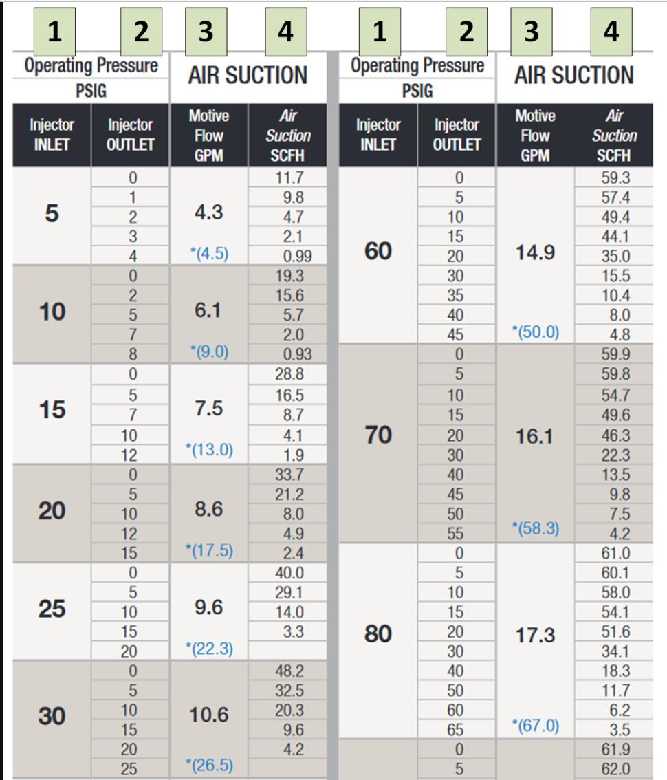很后一欄稱為空氣吸力,列出了在這些對齊的射流器入口/出口壓力下可以吸入水流的氣體(氧氣,臭氧,空氣)的數量。