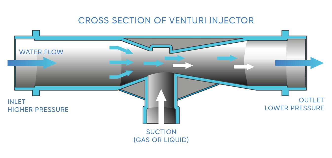 簡而言之,水流入文丘里管的壓力高于其排出的壓力。這種壓差在設備側面的吸入口產生真空。這會將空氣、臭氧或液體吸入主流水流中。因此,壓差越大,真空度越大,混合效率就越高。