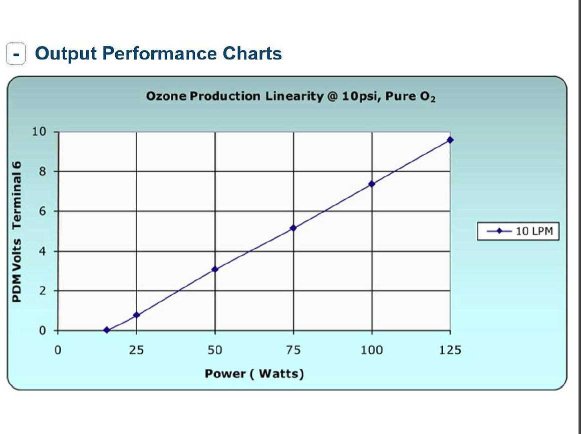 10 grams/hour, 5% concentration @ 2 LPM oxygen feed, 10 psig